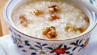 核桃肉20克,粳米100—200克。將核桃肉洗凈搗碎,與粳米同煮成粥,能潤肺止咳,補腎固精,潤腸通便。但有痰火、積熱或腹瀉者忌食。