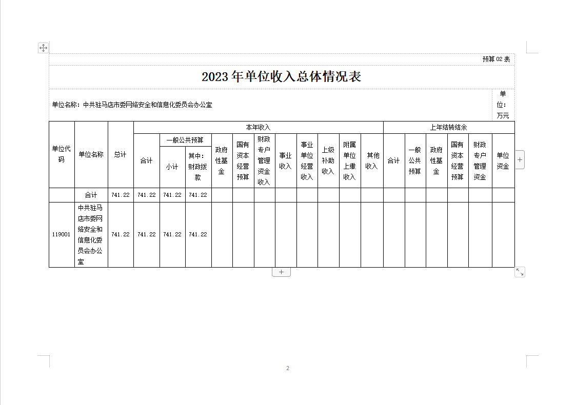 中共駐馬店市委網絡安全和信息化委員會辦公室2024年收入合計741.22萬元。其中:一般公共預算收入741.22萬元。