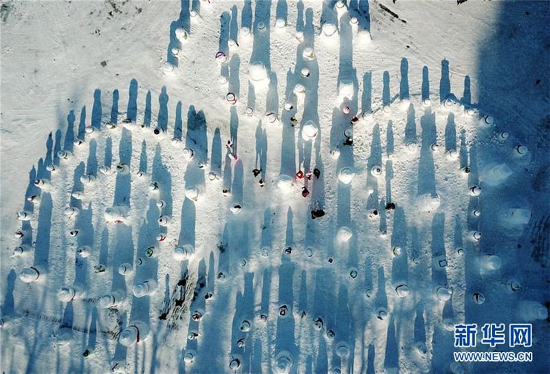 1月2日,市民、游客在雪人群中游玩觀賞(無人機拍攝)。2019個各式各樣的雪人,近日在冰城哈爾濱市的松花江畔亮相,引來眾多市民游客游玩觀賞。新華社記者 王建威 攝