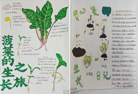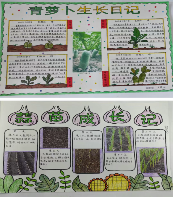 同學們將自己的種植計劃與觀察到的蔬菜生長過程,用畫筆精心繪制成“蔬菜小報”。一張張精美的小報,展現了孩子們在種植中的用心與觀察的細致。